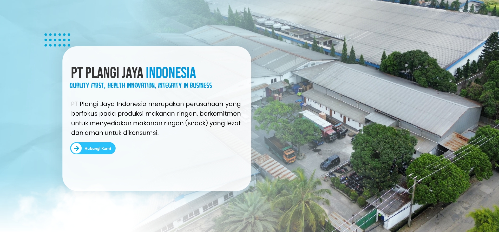 PT Plangi Jaya Indonesia adalah perusahaan yang bergerak di bidang produksi makanan ringan, dengan komitmen tinggi dalam menghadirkan produk yang lezat, aman, dan berkualitas. Mengusung filosofi “Quality First, Health Innovation, Integrity in Business”, perusahaan senantiasa mengutamakan kualitas, inovasi dalam kesehatan pangan, serta menjunjung tinggi integritas dalam setiap aspek bisnisnya.